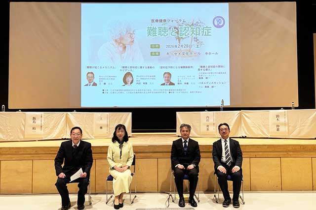 2026年2月28日に、松本市のキッセイ文化ホールで「難聴と認知症」をテーマに医療健康フォーラムを開催いたしました。当日は市民の皆さま約600人にご参加いただき、きこえの仕組みや、難聴と認知症の密接な関係、適切な補聴器の装用について理解を深めていただきました。会場ではパネルディスカッションも行い、また多くのご質問を通して関心の高さがうかがえました。補聴器ブースにも多数お立ち寄りいただき、実際の機器に触れていただき、説明を受けていただく機会となりました。本フォーラムが、市民の皆さまのより良い聞こえの一助となれば幸いです。今後も様々なテーマで開催してまいりたいと考えております。